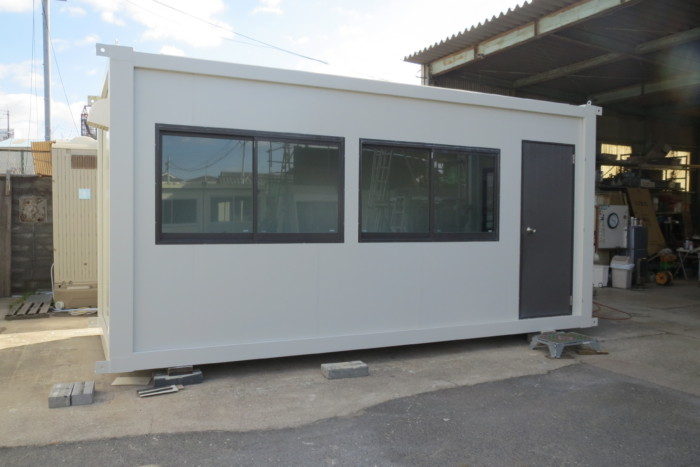 店舗仕様の前面に窓が2枚設置されたコンテナハウスです。10年落ちのハウスでさすが、まだまだ現役です。是非、弊社堺ヤードにてご覧ください